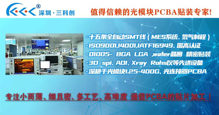 光纖在線訊,深圳三科創(chuàng)代工光模塊行業(yè)PCBA有近十年的經(jīng)驗,從10G,25G,100G一直到最高速率是400G,與時俱進,跟隨行業(yè)脈絡,不斷創(chuàng)新,不斷成長。近期三科創(chuàng)公司巳建好萬級無塵車間,并投入用于高速模塊化產(chǎn)品的生產(chǎn),除高速率100-400G光模塊貼裝,該車間也具備為激光雷達PCBA貼裝加工服務的能力。